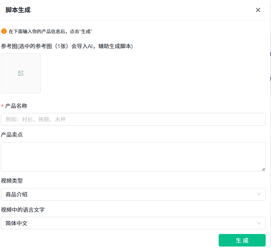 上传产品图片→填写产品名称→AI自动生成脚本→用户确认→一键生成视频(平均耗时:5分钟)